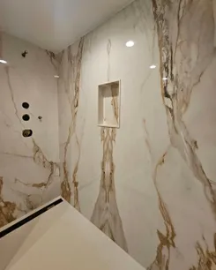1. Seamless Aesthetic: One of the most significant advantages of large format panels is the sleek, seamless look they create. Fewer grout lines contribute to a cleaner and more modern appearance, ideal for bathrooms, kitchens, and commercial spaces. Bookmatching large porcelain panels can create a dramatic visual effect where veining continues seamlessly across panels, forming a stunning focal point.